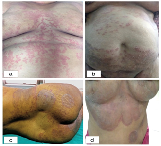 Figure 7 (A) Extensive erythematous, annular and partially annular lesions (B) Extensive tinea corporis with multiple scaly lesions. The lesions over lower abdomen have extended downwards to involve groin (Tinea corporis et cruris) mons pubis, labia majora and labia minora (Tinea genitalis), (C) Healed annular hyper-pigmented plaques with appearance of new lesions at the periphery (Tinea recidivans) (D) Extensive erythematous, hyper-pigmented lesions with hypertrichosis over the front of chest and under breasts, dumb bell shaped double-edged tinea.