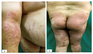 Figure 8 Man with extensive dermatophytosis of multiple anatomic sites. Striae over abdomen and thighs. Developed iatrogenic Cushing’s syndrome, bilateral osteonecrosis of femoral head, central obesity and hypertrichosis. History of having used topical and systemic steroids.
