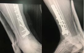 A 58-year-old woman presented in July 2017 to the Emergency Department at Hassan II University Hospital, Morocco, due to the rapid onset of fever, and a suspected skin infection. She had a previous medical history of a fracture of the lower quarter of the leg which was treated by a plate osteosynthesis (Figure 1) (Figure 2). She had a sharply demarcated, warm, and painful erythema on her leg surmounted by vesicles in places, purpuric by others, taking the operative scar (Figure 3). Vital parameters showed a temperature of 38.0°C, respiratory rate of 18breaths/min, O2 saturation of 96% on room air, heart rate of 80beats/min, and blood pressure of 120/70mmHg. Oral examination showed no signs of infection, and examination of lymph nodes was normal. Her laboratory results showed a white blood cell count of 22100/mm3, her CRP was 235mg/L. The radiological examination of the leg revealed a fracture in the process of consolidation without radiological signs of sepsis on the osteosynthesis material. She was clinically diagnosed with erysipelas she was treated with intravenous amoxicillin + clavulanic acid. Clinical and biological improvement was noted, resulting in the switch to the oral route on the fifth day of treatment. The patient received 21days of antibiotic therapy. The evolution was marked by the complete disappearance of the cupboard with a decline of 1 year and a half without recurrence.