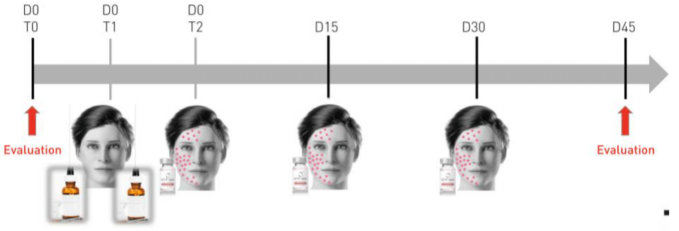 The study was conducted over a period of 6 weeks. To compare the efficacy of TCA peeling alone or in combination with NCTF®135HA on the same patient, both sides of the face were treated with 15% TCA peeling while only one side was injected with NCTF®135HA. Three injection sessions were conducted at D0, D15 and D30 by NCTF®135HA while the TCA peeling was performed only at D0 (Figure 1).