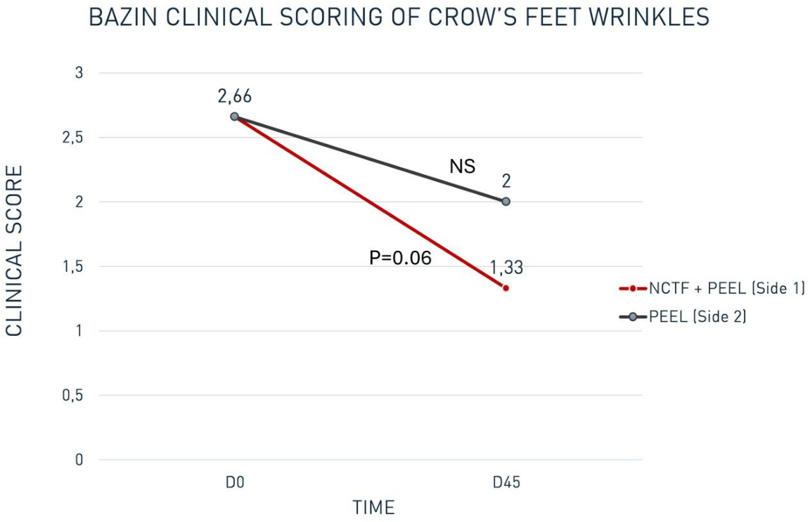 At baseline (Day 0), the mean crow's feet wrinkle score (Bazin crow's feet scale) (Table 1) for both sides of the face were 2.6. This value decreased to 1.3 with a significant tendency on the side treated with TCA and NCTF combination (p value=0.06), but not on the side treated with TCA alone (NS) (Figure 2).