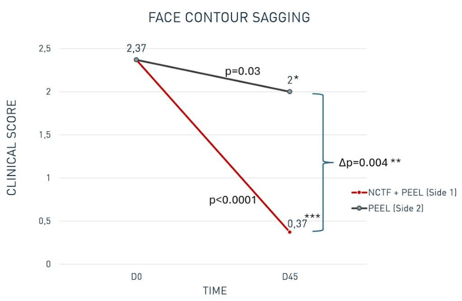 Results: At D45, clinical scoring demonstrated a significant difference in reducing the lower face sagging score, increasing skin hydration, and improving skin homogeneity on the side treated with NCTF®135HA combined with peeling compared to the side treated with peeling alone. There is a tendency for improvement in Crow’s feet only on the side treated with both peeling and NCTF®135HA, compared to the side treated with peeling alone. Both the evaluator and the patient reported a greater improvement on the side of the face treated with 15% TCA + NCTF®135HA on the Global Aesthetic Improvement Scale (GAIS).