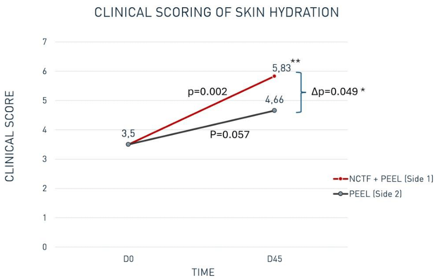 Hydration: In comparison to 15% TCA alone (mean score of 4.7 at day 45, evolution NS, delta D45-D0 of 1.2 scores), the mean hydration score increased significantly only on the face-side treated with 15% TCA and NCTF®135HA from D0 to D45 (mean score of 5.8 at day 45, significative evolution with p=0.0026, delta D45-D0 of 2.3 points (Figure 4).