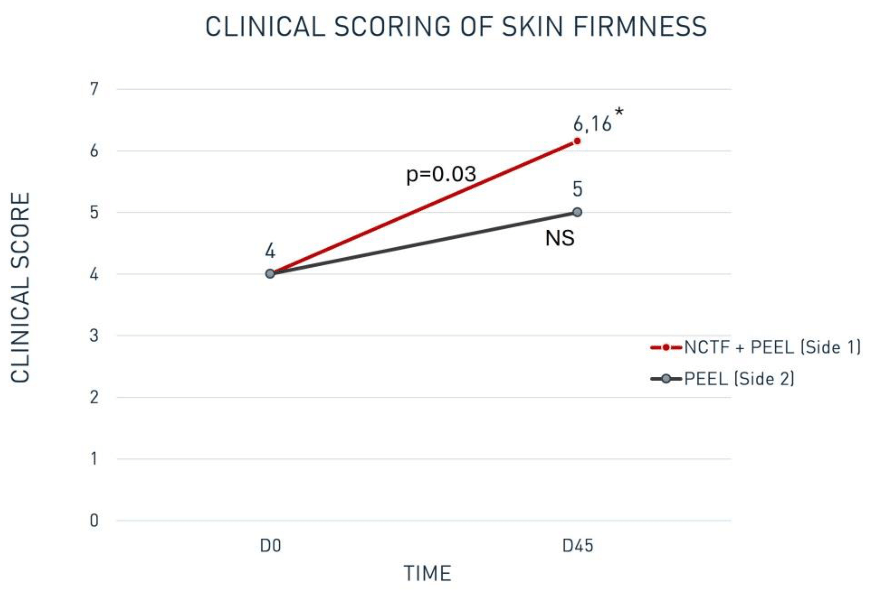 A 9-scale clinical scoring system was utilized to assess skin firmness. The results showed a significant improvement in skin firmness on the side treated with TCA and NCTF (6 at day 45 against 4 at baseline, p value=0.03), but not on the side treated with TCA alone (4.8 at day 45 versus 4 at baseline, p=0.3).