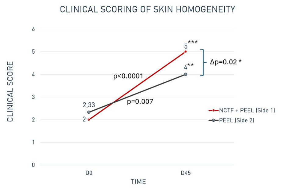 Skin Homogeneity was remarkably improved on both treatment sides (peeling with and without NCTF®135HA) However, this improvement was significantly much greater on the face-side treated with the combination of 15% TCA + NCTF®135HA versus peeling alone (p=0.02) (Figure 6).
