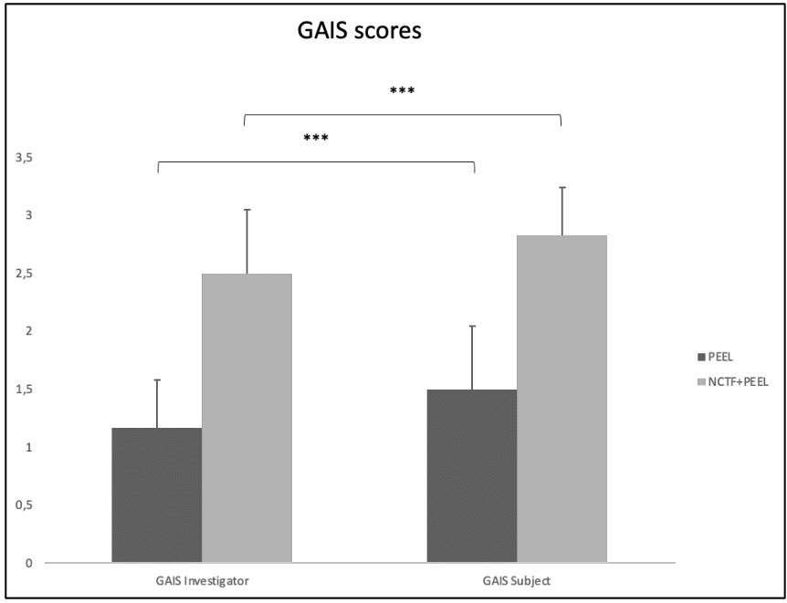 After objective examination, as shown in Figure 7, the physician reported mean scores on the GAIS of 2,5 (much improved, p< 0.001) on the side of the face treated with 15% TCA + NCTF®135HA compared to the side of the face treated with 15% TCA alone (mean score of 1.16 (improved), p< 0.001).
