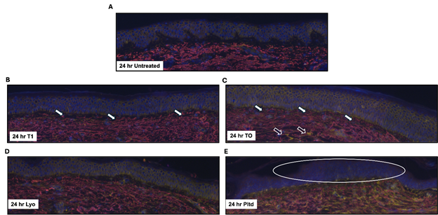 Discarded skin was cultured using the established ex vivo model and left untreated (A) or treated with T1 (B), TO (C), Lyo (D), or Pltd (E) for 24 hr. The tissue was processed, and sections were stained to assess tropoelastin (red) and CD44 (yellow) by immunofluorescence. DAPI was used to detect the nuclei (blue). Representative images are shown. The samples were prepared in duplicate, and representative images are shown. White-filled arrows indicate areas of tropoelastin migration in the DEJ. The open arrows indicate areas of HA stimulation. The oval represents poorly defined epidermal cells.