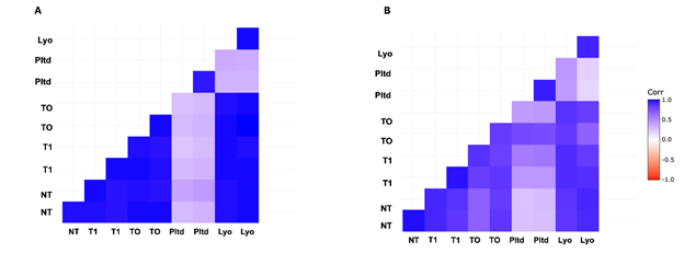 DESeq2-normalized counts of protein-coding genes were used to generate the correlations. Positive correlations are displayed in blue and negative correlations in red color. The colored legend shows the correlation coefficients and the corresponding colors. (A) 24 hr. treated samples (B) 7 day treated samples.