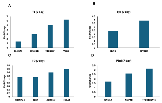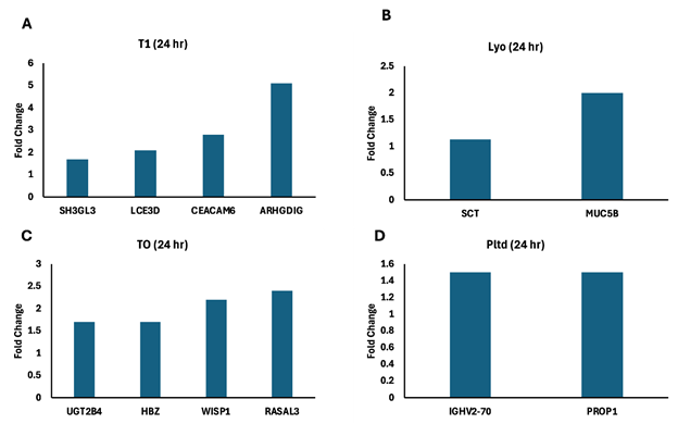 As far as gene expression is concerned, the significant differentially expressed genes with these formulations differed completely from group to group at 24 hrs. and at day 7. At 24 hours, the signature of the upregulated genes for T1 involved fibronectin matrix, cell cycle, notch signaling, endocytosis and keratinization, while the TO signature involved Wnt signaling, wound healing, PPARA expression, and lipophagy. The Lyo signature showed inhibition of phagocytosis and o-linked glycosylation of mucins, while the ‘Pltd’ group showed complement activation and cell death signaling (Figure 4).