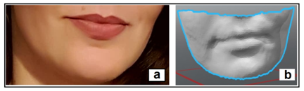 In order to collect digital data of an individual’s lips, a scan of the lips was performed, (Figure 1a). Raw digital data of the lips profile were obtained in the scanner software and used to create a digital image model of the lips (Figure 1b). The digital image model of the lips was subsequently transferred to a 3D computer graphics software, Autodesk 3ds Max (Autodesk, US), and then subjected to optimisation and modelling.