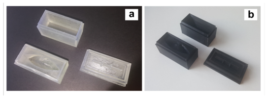 The moulds produced using the three investigated materials were filled with a lipstick formulation, closed with their respected bases, inverted, and placed in a fridge for 15 min. After removing the moulds it was found that the personalised lipstick was successfully detached only in the case of the PLA lipstick applicator (Figure 3). It was found that ABS could also be used. However, the lipstick retrieval from the mould was not consistently successful. In the case of the clear resin applicator, the lipstick could not be created on a consistent basis. The lipstick applicator is used by pressing the sculpted lipstick surface to the lips that deposits a uniform coating of the lipstick, thus removing the need for a mirror.