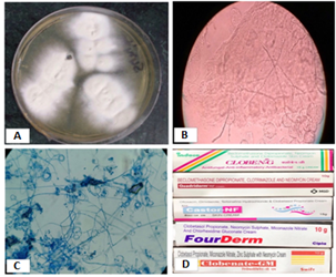 Figure 1 (A) Cottony beige colored growth of T. interdigitale after one week of incubation on SDA at 25°C; (B) Septate branching fungal hyphae in KOH mount; (C) Lacto Phenol cotton blue mount showing spiral hyphae, microconidia in grape like clusters and pencil shaped macroconidia (D) FDCs available as OTCs.