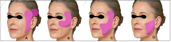 Figure 1 Scheme of the application according to the desired outcomes. A) Lifting effect in heavy faces with or without extension inside hairline; B) Lifting effect on consumed faces with zigomatic projection; C) Volumization for consumed faces; D) Skin quality improvement.