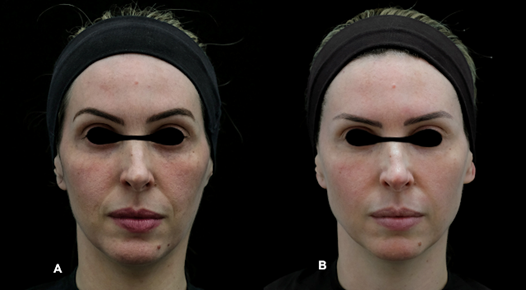 Figure 4 Example of a woman aged 35 years with volume loss in the temples and a narrow lower third of the face who needed to improve her facial proportions. The application was made in two sessions, three vials/session. A –Before; B – Six months after the last session.