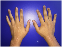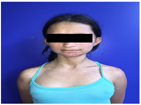 14-year-old female patient, product of a first pregnancy, non-consanguineous parents, is born at 38 weeks by natural delivery without any complications. There were no interest records in the family. She has a growth retardation and mild mental retardation background. She was addressed to dermatological consultation because she presented widespread skin lesions since birth. In the clinical examination her face symmetry with facial contouring was triangular, hypo pigmented atrophic lesions and erythematosus perioral papules, dental alteration (Figure 1) accompanied by cavities and low implantation prominent ears were found (Figure 2). She had, in her thorax and limbs skin, hypo pigmented, cribriform atrophymacules that alternate with hyper pigmented lesions in a Blaschkoid distribution predominantly in the right hemi-body (Figure 3). Some of her finger and toe nails were hyperplasia (Figure 4). She has skin-color verruciformis papules in her anogenital region.