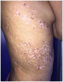 Figure 3 Hypopigmented, cribriform atrophy macules that alternate with hyperpigmented lesions in a Blaschkoid distribution predominantly in the right hemibody.