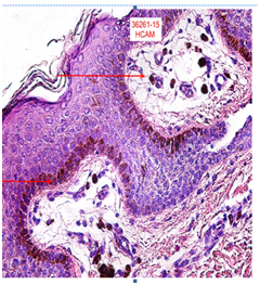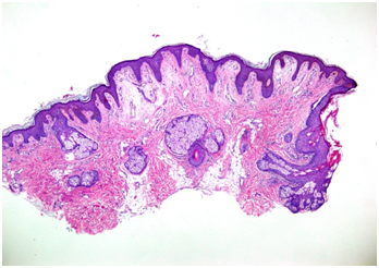 A skin biopsy was done and found hyperkeratosis skin, irregular hyperplasia of the epidermal rete ridges accompanied by mild and focal basal hyper pigmentation (Figure 5), papillary dermis presents a little lymphocyte infiltration and several small dilatedvessels accompanied by an increase of fat cells to the dermis. Focal rise of fatty tissue in the narrow (Figure 6). X-rays show decreased bone mineralization in the hands and feet and sclerotic joints in the feet. Her skull CTS, pelvic and thyroidal ultrasound were all normal. The patient has 46xx Blood cerotype, 17 hydroxy progesterone hormones, ACTH, normal AM cortisol. Thyroidal examination alteration, sub-clinic hypothyroidism, under pediatrics endocrinology treatment using levothyroxine.