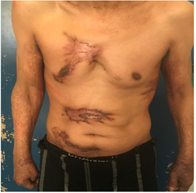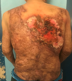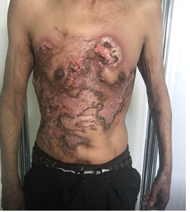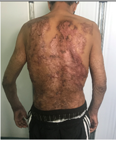 In the beginning, the patient presented painful pustules on his abdomen. They evolved quickly into blisters and ulcerations. They progressed into large ulcerations in the back. At that time, the patient had surgical debridement with worsening of his condition. Dermatological examination revealed two well-defined, deep purulent ulcers on the back measuring 40* 20cms (Figure1) and an ulceration on the posterior calf with oozing (Figure 3). Cribriform scars from previous lesions involved approximately 60% of the body surface (Figure 2). Biopsy specimens demonstrated the findings of an ulcer with heavy neutrophil infiltration of the dermis without giant cells of leukocytoclastic vasculitis. Cutaneous cultures for bacteria, fungus, and mycobacteria were negative. The histology and tissue culture findings were compatible with a pyodermagangrenosum. Laboratory tests revealed a white cell count of 10.24×109 /l, hemoglobin 120 g/l, and C-reactive protein 12 mg/l. All other tests were normal, including hepatic function tests, renal tests, HIV, immulogic tests (antinuclear antibodies, anti-neutrophil cytoplasmic antibodies), hepatitis, and Venereal Disease Research Laboratory test for syphilis. A body scan and colonoscopy were performed and was normal. They didn't reveal also extracutaneous organ inflammation. The patient was treated with systemic glucocorticoids (60mg daily) and topical wound care. After 2 weeks, a partial healing of the ulcer was noted. The ulcer of the back was completely healed after one month of treatment (Figure 4). But, he presented a recurrence in the chest (Figure 5). Thereafter the patient became lost to follow-up.
