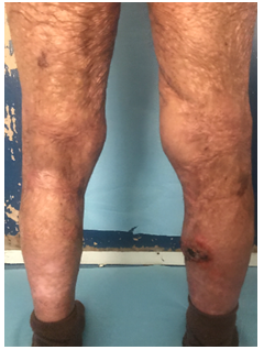 Pyoderma gangrenosum is a non infectious neutrophilic dermatosis with unknown origin. In contrast to its name, PG is neither an infectious nor gangrenous condition. Half of the cases have associated systemic diseases.1 Here in, we report a case of a 46-year-old male with no significant history of malignancies, systemic vasculitis, arthritis, inflammatory bowel disease, fungal infection, drugs, or cutaneous injury was referred to our Department for multiple ulcers appears on the trunk and limbs evolving with relapses and remissions. Clinical examination showed diffusely distributed, two, well-defined, deep purulent ulcers on the back and the calf measuring 4 to 40 cm, with severe oozing and erosions. Laboratory tests revealed a white cell count of 10.23×109/l, hemoglobin 120g/l, and C-reactive protein 12 mg/l. All other tests were normal, including hepatic function tests, renal tests, antinuclear antibodies, anti-neutrophil cytoplasmic antibodies, HIV, hepatitis, and Venereal Disease Research Laboratory test for syphilis. A body scan and colonoscopy were performed and was normal. The patient was treated with systemic glucocorticoids (60mg daily) and topical wound care with partial improvement.