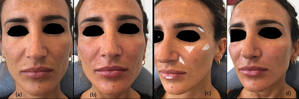 Figure 3 A 32yrs old patient of group 1 needs only the enhancement of the highlighting point. (a) before; (b) after; (c) injection points; (d) after photo lateral view.
