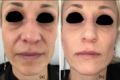 Figure 4 A 48 yrs old patient of group 2 seeking volume restoration treatment to defy the effects of time and gravity treated with 2.4 ml of HA Filler. (a) before; (b) after injection.