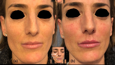 Figure 6 A 38 yrs old patient of group 2 seeking the volume restoration on midface, medical rhinoplasty and lips contouring. (a) before; (b) after injection.