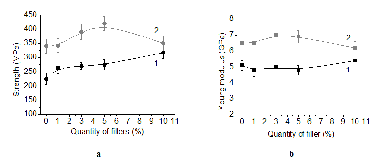 Figure 1 Dependents of strength (a) and Young modulus. (b) of PLA-based composites fibers on the concentration of CN modified PEG: 1 - orientational draw in 4 times (λ=4), 2 -orientational draw in 6 times (λ=6).