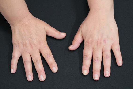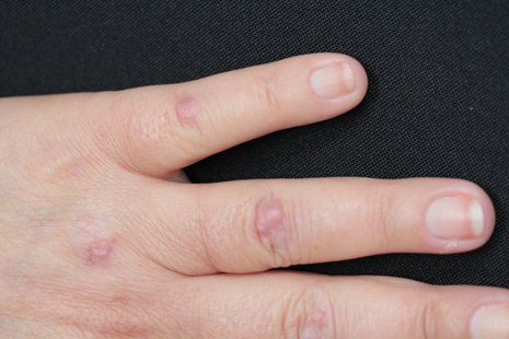 Figure 1 Erythematous papules and nodules with a smooth surface, over the metacarpal-phalangeal and in the proximal and distal interphalangeal joints, on the left hand.