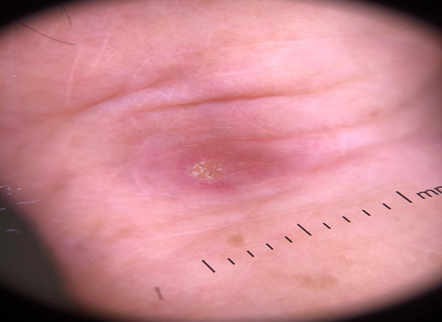 Figure 3 Dermoscopy showing a erythematous papule with a small area of ulceration, covered by keratotic scales.