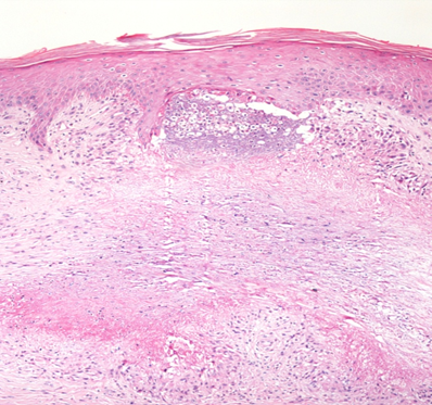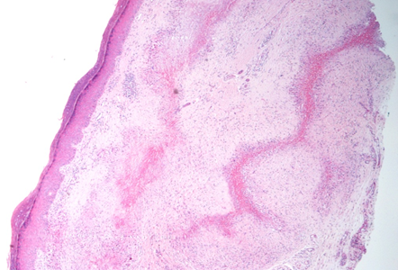 Figure 5 The lesion approaches the epidermis, outlining transepidermal shedding of necrobiotic collagen.