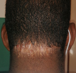 A 41-year-old man consulted for multiple skin tumors pruriginous, evolving since childhood and secondary to vaccinations, folliculitis, scratch lesions, and scarred wounds. There was no similar family history. The clinical examination noted multiple keloids, 4 to 9 cm in diameter on the trunk, in particular on the chest, on the shoulders and arms, in closets on the legs, with a large keloid at the level of the neck from 16 to 18 cm. The rest of the exam was unremarkable. The patient was treated symptomatically for small lesions and endocheloid surgery followed by brachytherapy for the nuchal keloid. The outcome was good. (Figure 1-3)