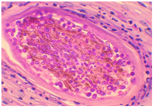 The histological study is useful in patients with negative cultures, it reveals spores surrounding the hair follicle and hyphae within the follicle. There is an inflammatory infiltrate in the dermis with giant cells and follicles destruction. Periodic acid Schiff (PAS) staining can confirm the diagnosis of Kerion (neutrophilic and granulomatous infiltrate in the early stages and fibrotic scar in the latter); the 4 histological types are presented in the (Table 5) (Table 4), Arenas et al.,16 conducted a study of histopathological and mycological findings in 19children with inflammatory tinea. In the mycological study found that the most frequent etiological agents was M.canis (32%), T.mentagrophytes (27%), T.tonsurans (21%), T.rubrum (10%), and M.gypseum (5%); the