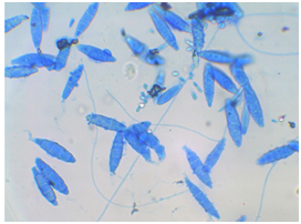 Clinical case 2A 13year-old boy presented with a 15day history of an indurated, erythematous scaling plaque with pustules, golden-yellow crusts and an alopecia patch with well-defined edges on the temporal region of the scalp (Figure 5). Asymptomatic and not previously treated. The scalp dermoscopy showed multiple white bands across the hair shaft, called ‘Morse code–like’ hairs (Figure 6). A superficial scraping of the lesion was performed for direct examination with a potassium hydroxide solution, where hyaline hyphae and spores were visualized (Figure 7). Sabouraud culture showed a powdery beige colony, suggestive of Microsporum gypseum that was confirmed by microscopic examination (Figure 8). Microscopy showed fusiform and thin-walled macroconidia with less than 6septum, arranged in groups and some microconidia (Figure 9). The patient was treated with Itraconazole for 6weeks, with complete clinical and mycological resolution.