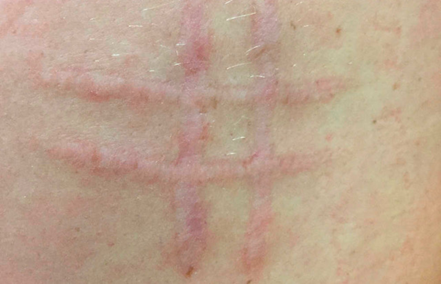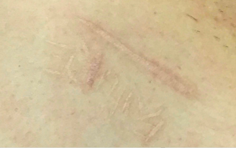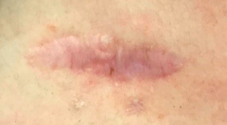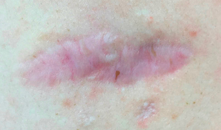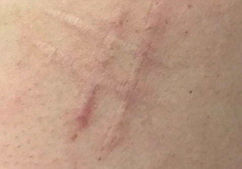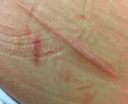 The presenting case is a 25-year-old female with hEDS who underwent laser treatment with postoperative topical 15% vitamin C serum (CE Ferulic, Skin ceuticals) for traumatic and surgical scars on the trunk and extremities. This patient had hypertrophic and atrophic scars, some with surrounding erythema. The hypertrophic scars were treated with 1:9 intralesional Kenalog: 5 fluorouracil approximately 4 weeks prior to the initial laser session due to symptomatic pruritus. Subsequently, all scars were treated over two sessions spaced eight weeks apart using a 595nm pulsed dye laser, 10mm spot, fluence 5J/cm2 , 1.5 ms pulse duration (Vbeam, Candela, Wayland, MA) and/or 2940 nm fractional ablative laser at 1-3 mm spot size, 100-140um depth, 5.5% density (Profractional, Sciton, Palo Alto, CA). The laser(s) chosen for each scar depended on individual scar characteristics (i.e., degree of erythema, hypertrophy, atrophy, etc) (See Table 1 for details). Following laser treatment, we advised our patient to apply topical vitamin C twice a day to the treated areas. Topical application was not used immediately post-laser. First application of topical was performed the same day several hours later at-home.