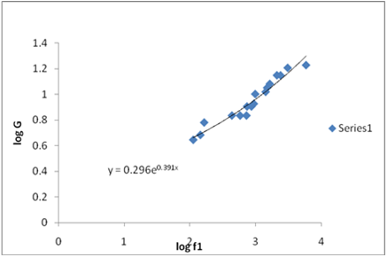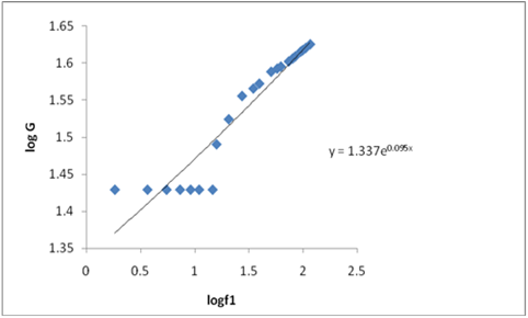 In our study, a number of gelling agents were tried (Figure 1-3); but 6% NaCMC was found the best for rheogram study and for turmeric hydrogel preparation. The rheogram of turmeric hydrogel was nonlinear and exponent of the rheogram was 1.34. Such results signifies that a continual addition of stress (f) on gel failed to produce a proportionate change in rate of shear (DG ) (Figure 3). This means the relationship between DG versus f (values being taken on log scale) was not linear; rather nonlinear meaning Non newtonian. So the plot drawn with DG versus f was exponential and the exponent term was 1.34. As the exponent term was greater than unity so flow was Non Newtonian more specifically-pseudoplastic.14 Such results are in line with others. According to Martin et al, 1993 and Rawlins, 2004 polymers like cellulosic materials in solution exhibits pseudoplastic flow.12,14 Usually the rheogram for a pseudoplastic material begins at the origin (or at least approaches at which low rate of shear lies, where yield value is lacking). This makes the rheogramn non-linear and at this point resistance of the material decreases with increasing rate of shear. Here the curved rheogram results from a shearing action on the long chain molecules of a linear polymer. As f increases it starts the normally disarranged molecules to align the long axes in the direction of flow causing a decrease in the internal resistance of material and allows a greater rate of shear at each successive shearing stress. Na CMC is a high molecular weight synthetic polymer of acrylic acid, cross linked with allyl sucrose and containing a high proportion of carboxyl group. In the present study it was used as a gelling material. Therefore, non linearity of the rheogram was in general agreement with others.