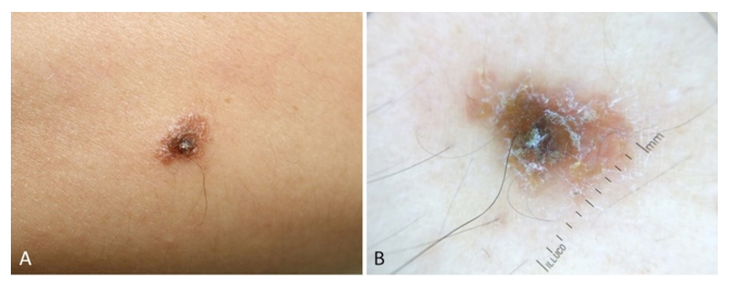 A 37-year-old woman presented with a 2-month history of pruritus on a previously existing pigmented lesion located on the right forearm. The patient denied local trauma, recent ultraviolet exposure, and was not taking any medication. On physical examination, a solitary brown papule was seen surrounded by a symmetrical halo of sharp eczema (Figure 1A). Dermoscopy showed a central pigmented lesion bordered by vivid erythema and partially covered by flakes and crusts (Figure 1B).