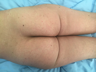 A 34–years- old female, was diagnosed with lupus erythematosus and Sjögren’s syndrome, was treated with antimalarials and steroids. She presented few months after the diagnosis, rapid onset of cutaneous lesions. At the moment of the diagnosis, she was taking 15mg a day of prednisolone. Clinical examination showed 18 well-circumscribed round fierm brown round papules, with a size of 3 to 15mm in diameter, with dimpling signs. The lesions were on the buttock, the thighs and the lower back. The papules were clinically typical of dermatofibromas. Dermoscopy found five different patterns: most lesions had a scar like central white patch surrounded by a pigmented network. Other patterns included a homogeneous pigmented pattern, a composed pattern, lentigo-like and seborrheic keratosis-like patterns. Excision biopsy specimen taken from the thigh found a proliferation of fibrohistiocytic spindle cells between the collagen fibers, making well-demarcated nodules located in the dermis, with no mitotic figures. The histological findings allowed us to retain the diagnosis of dermatofibroma.