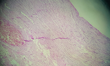 Figure 3 Histological section showing fusiform cells arranged in short bundles, with some histiocytes. Laterally, the lesion infiltrates thick dermal collagen. There are no nuclear atypies. No atypical changes in nucleus.