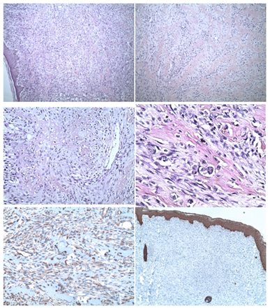 Figure 2 Tumour proliferation sarcomatoid of the dermis and hypodermis with spindle cell, globoid and osteoids, (A,B) with cellular atypia consisting of anisokaryosis and mitosis. (C,D) These cells express diffusely vimentin (E,F), and do not express cytokeratin.