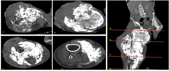 Figure 3 MRI: large, heterogeneously calcified predominantly hypo dense tissue mass heterogeneously enhanced after contrast containing areas of liquefaction measuring 28x20x50 mm. This mass invades muscle, fat and skin tissue with bone lysis of the femoral bone in localized areas. Above it reaches the iliac psoas muscle and the right muscle of the right abdomen, sheathing the common homolateral femoral pedicle, which remains permeable. Below it reaches the anteromedial compartment of the right leg.