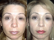 Figure 5 (A) A 49-year-old female with an enlarged dorsum and tip. (B) Improvement of the nose with 0.95 ml of HA distributed on six nasal zones.