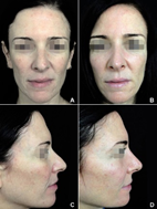 Results: NSR-HA was performed in a single session. Volume average per patient/treatment was 0.73 ml and per point/treatment was 0.17 ml. Comparing images of the nose before- and after-NSR showed a significant improvement of the nose appearance. Patient satisfaction was quantitatively demonstrated by the ROE questionnaire scores of 31.04% before-NSR against 73.33% and 70.00% at months one and twelve, respectively, after-NSR. The difference of 3.33%, greater at month one than month twelve, indicated no significant changes in the nose appearance for twelve months.