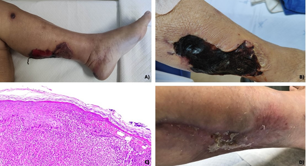 Figure 1 A) Serohematic blisters 1-15 cm in diameter on the left leg. B) Well-defined, 1-15 cm, irregular and raised borders, necrotic ulcers on the legs. C) Cutaneous ulceration associated with epidermal necrosis, with marked transcutaneous suppuration. D) Clinical resolution after intravenous flucloxacillin for three weeks..