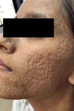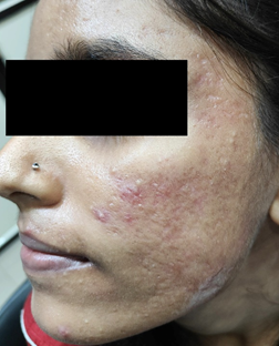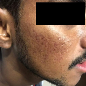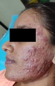 A 17-year-old girl presented to us with extensive comedonal (both open and closed) acne over the face for four months (Figure 2). She had been applying over-the-counter steroid creams for over a year. Initially, she was asked to stop the cream and was started on a combination of adapalene-clindamycin gel and sunscreen. Within a matter of 3 weeks, she developed extensive tender erythematous papulo-nodular acne (due to steroid withdrawal, Figure 3). In order to achieve rapid control, we treated her with 2 sessions of Jessner’s peel 3 weeks apart along with pulse steroids orally. The remissions were very brief and she relapsed quickly. Hence as an alternative, red-led light therapy was started after stopping all her previous treatment. Light therapy was done twice weekly with four minutes duration, over each side of the face for 3 weeks. Within three weeks of starting treatment, all her inflammatory papulo-nodular acne lesions resolved (Figure 4). No post-procedural side effects were noted. After attaining complete remission, she was started on isotretinoin and continued with a weekly session of red-light therapy for 6 more weeks after which she was weaned off from light therapy. The patient is still on regular follow up with us for last 8months without any relapse and visibly excellent results.