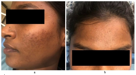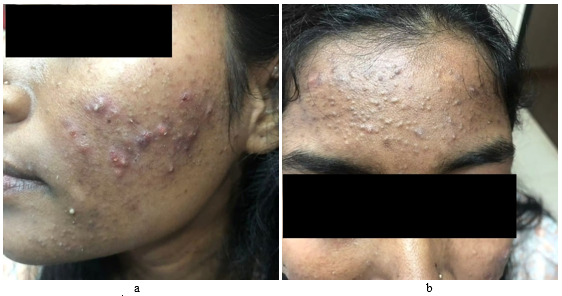 A 24-year-old female presented to us with erythematous papulo- nodular acne with a lot of comedones over her face (Figure 5a & Figure 5b). She had been using triple combination cream (Hydroquinone+Mometasone+tretinoin) for over a year, to look fairer. She was asked to stop the triple combination cream and underwent 3 sittings of peel (TCA, Jessner’s, and Salicylic acid) one month apart along with oral isotretinoin for nearly three consecutive months with a waxing and waning course. Hence, we started the patient on red-led light therapy for four minutes on each side of the face, twice weekly. After 6 sittings of the treatment, all the papulo-nodular and comedonal acne lesions resolved with no side effects (Figure 6a & Figure 6b). She was maintained on isotretinoin for another 2 months during which we did not see any relapse.