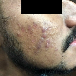 A 24-year-old male patient presented with comedones, papules, and nodules over the face (Figure 7). He was started on oral isotretinoin, topical adapalene-clindamycin, and sunscreen. The patient did not show any signs of improvement even at 4 weeks. Hence, for this patient also, we started red light therapy. After starting light therapy with twice weekly sessions, lesions started to resolve. After 5 sittings of red-led light therapy, his inflammatory lesions almost resolved (Figure 8). No side effects were experienced by the patient either during the procedure or post-procedure.