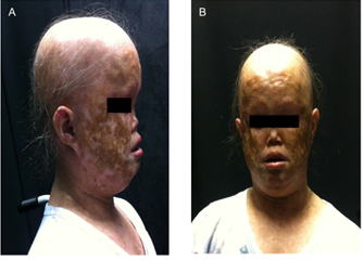 Figure 1 A Lateral view of the patient at 56 years of age showing alopecia, madarosis and hyperchromic spots on the face. (B). Front view.