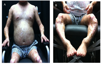 Figure 2 A Brownish spots alternating with hypochromic spots on the trunk, underdeveloped breasts, short stature, hypoplasias on fingers and toes, syntactyly. (B) Detail of anatomical deformities of the legs.