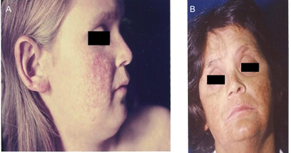 The manifestation of the disease may occur early in life.1,2,3 In the present case, only malar erythema occurred early. Cataracts, alopecia, madarosis, deformities of hands and feet, changes in long bones and atrophies occurred in adulthood.