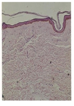 Histopathological examination of the forearm skin showed atrophy of the epidermis, rarefaction of the appendages, melanophages in the upper dermis and hydropic degeneration of the basal layer (Figure 4).